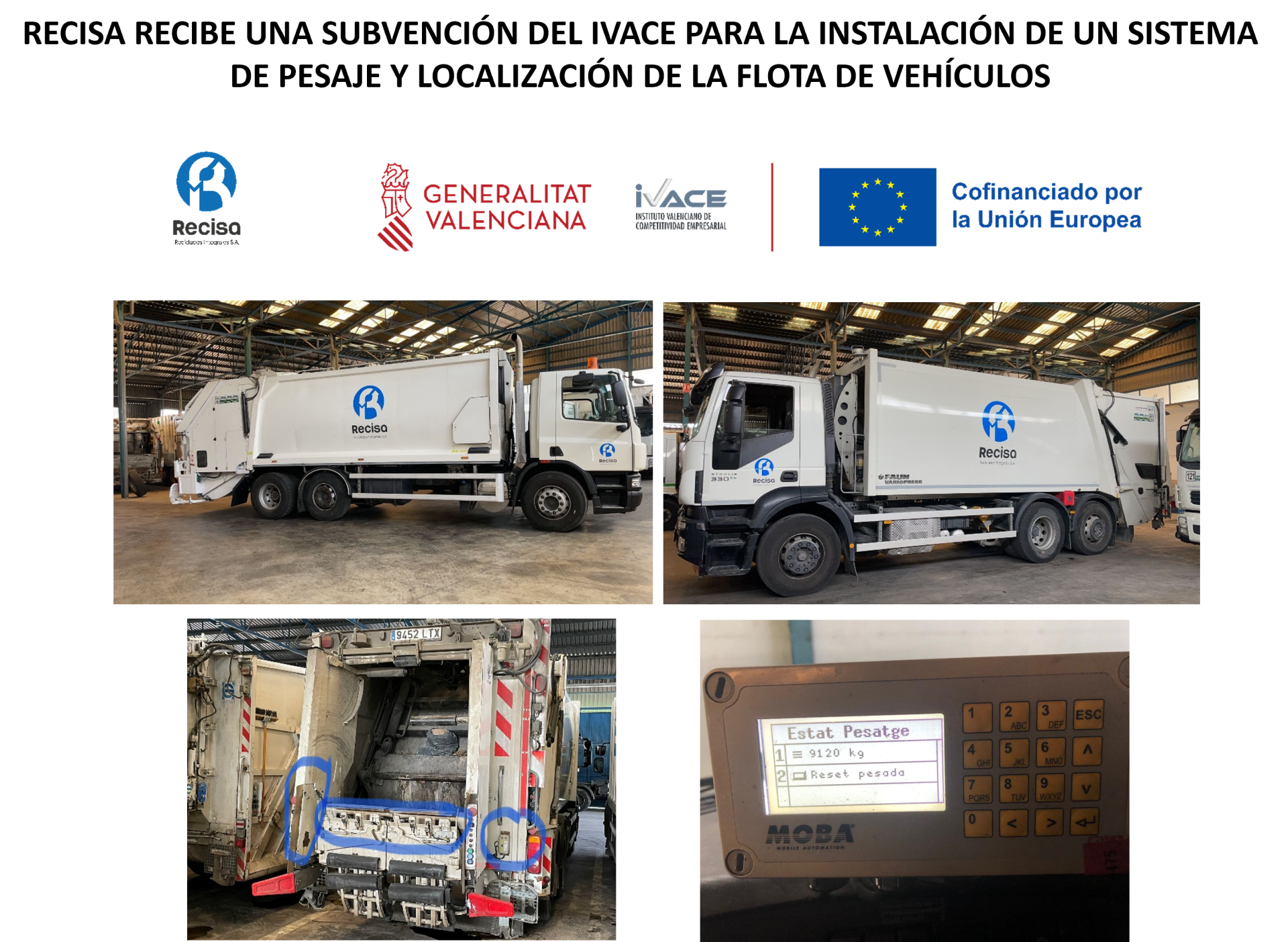 El Instituto Valenciano de Competitividad Empresarial (IVACE) ha concedido a la mercantil una subvención para la instalación de un sistema de pesaje y de localización de la flota de vehículos de la empresa. De esta forma se puede saber el peso de cada contenedor que se descargue en la tolva del camión y el total que lleva. Al mismo tiempo se puede conocer la localización del vehículo y la ruta realizada.